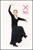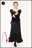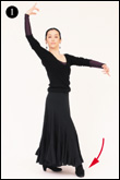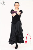 基本の姿勢どおり、ひじを張ったままブラソを交差させる。右ひざをスカートが跳ね上がるくらい高く上げ、右足を軽く一歩前におく。手首は、最初から最後までゆっくりと回し続ける。 |