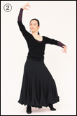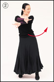 左足で横にさらに一歩進む。次のコンパス(●1)で右ブラソを下ろして左ブラソと交差させ、最初のコンパス(●1)に戻る準備をする。そして、最初のコンパス浮ゥら左右逆向きの動きを繰り返す。 |