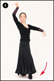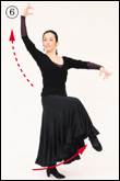右ブラソを高く上げたまま、右ひざをスカートがふわりと揺れるくらい高く上げる。このとき、右足首をしっかり伸ばし、靴の裏を見せないように注意する。また、コンパス(○6)から次のコンパス(○5)までは、両ひじを張って胸を開き、左右のブラソが引っ張りあう形になるよう意識する。 |