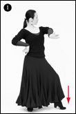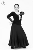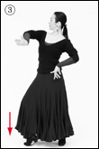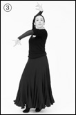 右ブラソを上げ、左ブラソはひじを張って軽く曲げて左足ゴルペ。背中はややそりぎみにして、目線はやや上に。手首は、最初から最後までゆっくりと回し続ける。 |