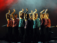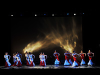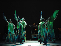 漆黒の中で白い光に浮き上がるグリーンのシージョと2色の扇子。出だしの美しさは、言うこと無しでした。全体的にスピード感があり、踊りも溌剌としており、昨年の舞台からの成長著しいグループでした。踊るということの楽しさが自然と伝わるグループでした。素直な心がそのまま表れた嫌味の無い素晴らしい演目でした。 |