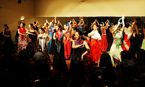 本番数日前に厳しく指導させていただきましたが、当日は明るく、のびのびと表情もとてもよかったです。なにより衣装がとても似合っていたことと、3人がとても楽しそうに踊っていることが印象的でした。この会全体を明るくするグループでした。エスコビージャにばらつきがあったので、これを一人ひとりがきちんとやってより見応えのある充実の踊りを見せてください。 |