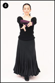 基本の姿勢どおり、ひじを張ったままブラソを交差させる。右ひざをスカートが跳ね上がるくらい高く上げ、右足を軽く一歩前におく。手首は、最初から最後までゆっくりと回し続ける。 |