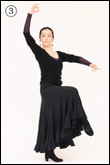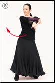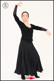 右ブラソを高く上げたまま、右ひざをスカートがふわりと揺れるくらい高く上げる。このとき、右足首をしっかり伸ばし、靴の裏を見せないように注意する。また、コンパス(○6)から次のコンパス(○5)までは、両ひじを張って胸を開き、左右のブラソが引っ張りあう形になるよう意識する。 |