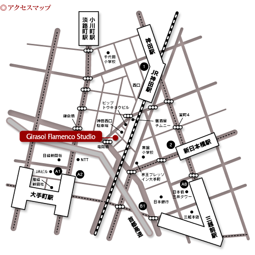 JR総武線「新日本橋駅」からの徒歩アクセス JR総武快速線「新日本橋駅」の2番出口(日本橋宝町4丁目、日本橋本石町4丁目方面)から地上に出て、右に進みます。1つ目の信号(右角に「Next Office」の看板)を右に曲がり、しばらくまっすぐ進みます。右手に「中古釣具専門店タックルベリー」という黄色い看板のお店があるので、その交差点を左に曲がります。高架下をくぐり抜けるとほぼ正面に自動販売機があり、そのすぐ右脇の路地に入りますと左手にGirasol Flamencoの看板が見えます。そのビルの地下1階に下りてください。 |