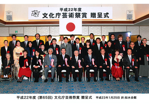 当日は文部科学大臣・木義明氏、文化庁長官・近藤誠一氏をはじめとした主催関係者と、各賞受賞者、審査員の先生方などが出席され、大変華やかな式典となりました。