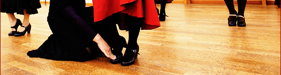 基本姿勢 最初に基本的な姿勢や足の打ち方、また打ち方の組合せなどを学ぶところからはじめます。踊りの姿勢は、体を引上げ、全身をコントロールすることが大切です。良い姿勢はすべての基本となります。 |